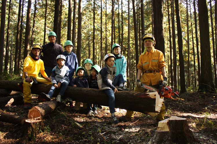 参加者が多かったので2班に分けての活動です。我々は「木こり体験」からスタート。木こりのソマウッドの鈴木さんから、山の事、木の事の話を聞いて、間伐という作業を力を合わせて皆さんで行いました。