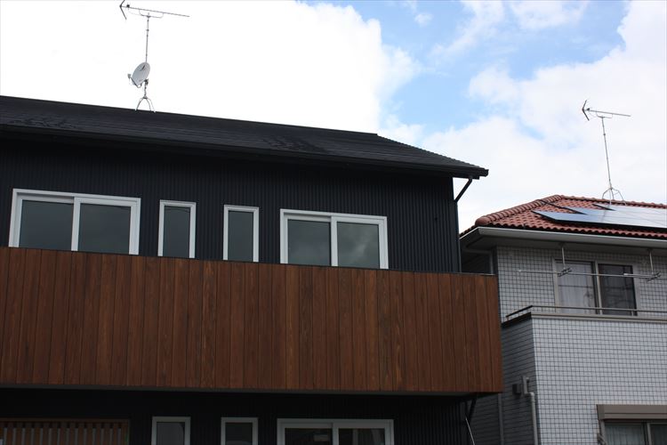 外壁に無垢の杉板を使用し重厚感を演出、黒のガルバリウムの外壁とのバランスもGOOD
