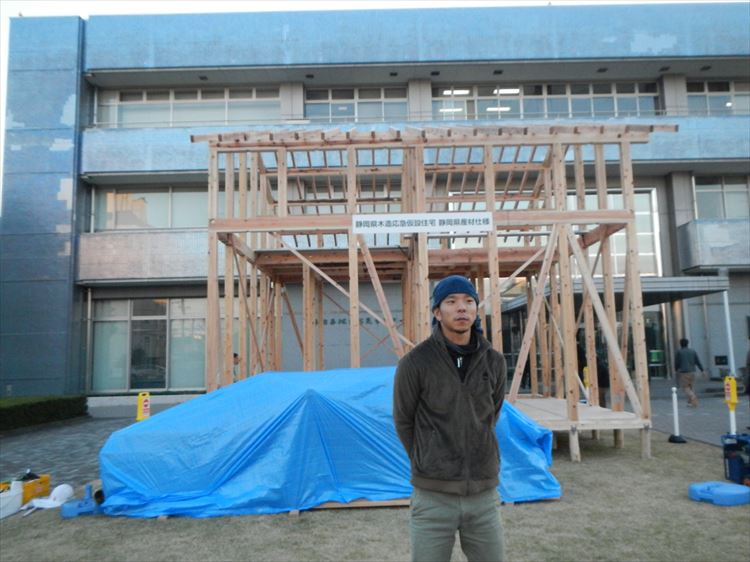 今年の4月9日に静岡県と静岡県木造応急仮設住宅建設協議会との間で災害協定が締結されました。これまでプレハブ作りの仮設住宅の建設しか出来なかった静岡県にも、やっと木造での仮設住宅の建設を行うことが可能となりました。東日本大震災で仮設住宅に住まわれている方の聞き取り調査でも、住み心地が良いこと・癒されることが確認されています。今回は実際の仮設住宅の建設を行い、その流れや問題点などの確認を行いました。