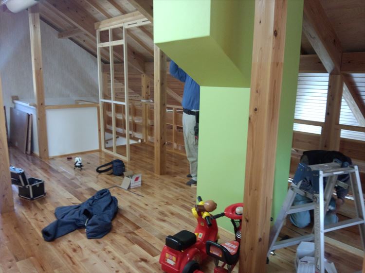 今日から始まった子供部屋の間仕切り工事他防音工事の現場は、子供部屋をオープン空間な空間でお引き渡ししていたところを、お子さんの成長に合わせて簡易壁で間仕切りを取り付ける工事です。