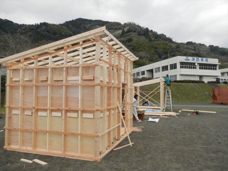 静岡県消防学校よりお話を頂いて、現在学校のグランド内に3坪の小屋を2棟建設しております。この小屋、パッと見ると物置のように見えますが、実は用途が違うのです。