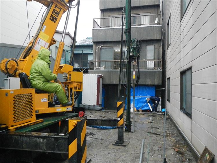 写真で見て頂いても分かるように街中の狭小地での地盤改良工事という事もあり、セメント系のプラントを敷地内に設けるのも難しく、口径の大きな鋼管杭も置き場の確保も難しい状況でした。しかも接道道路は静岡の繁華街に近く歩行者も多い。そこで今回採用したのがRES-P工法という地盤改良工法です。