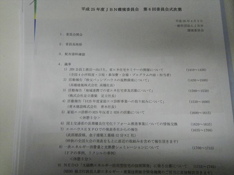 環境委員会に参加されている会社さんは、全国各地でご活躍されている会社さんが殆どで、環境やエネルギーに関してのトップランナーでもあります。足立建築さんの発表でもありましたが、JBN全体を盛り上げて行くためには、トップランナーが突っ走って行ってしまわないで、各地の工務店さんへのフィードバックが大切です。