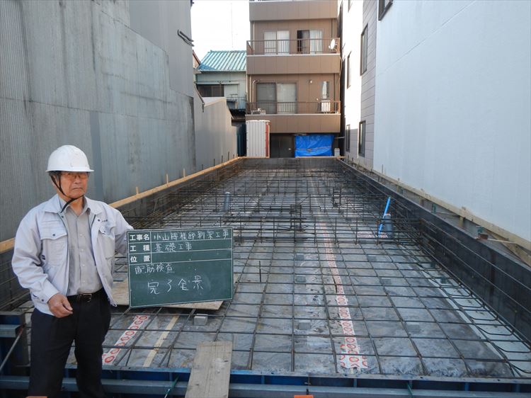 基礎の鉄筋が設計図通りに組まれているのか、太さの間違いがないかをチェックし、次の工程の生コンの打設に移ります。生コンは30N/㎜2(呼び強度)の一般的なコンクリートの1.5倍位の強度のものを打設します。強度が強いほど、耐用年数は長くなります。上物の建物が100年大丈夫でも、基礎が50年しかもたないのでは意味ないですからね。