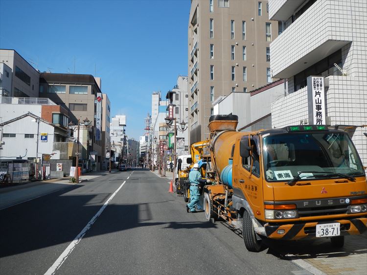 現場は静岡の繁華街の狭小地。こんなに全面道路が広くても、何と大型規制の区間です。小型車で約20㎥の生コンの打設をしましたので、台数が多くなり大変でした。
