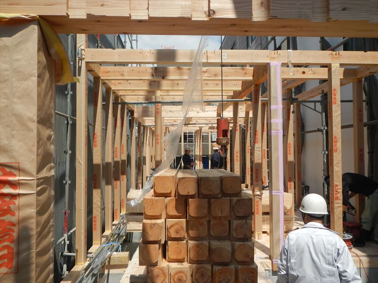 昔から商売を営まれているお宅の建て替えということで、お店で使われていた大黒柱と大梁を再利用することで昔の面影を少しでも残す設計としました。大工さんに新たに手加工してもらい、無事に現場に収めることが出来ました。これから新たな歴史を刻んでいくこととなるでしょう。
