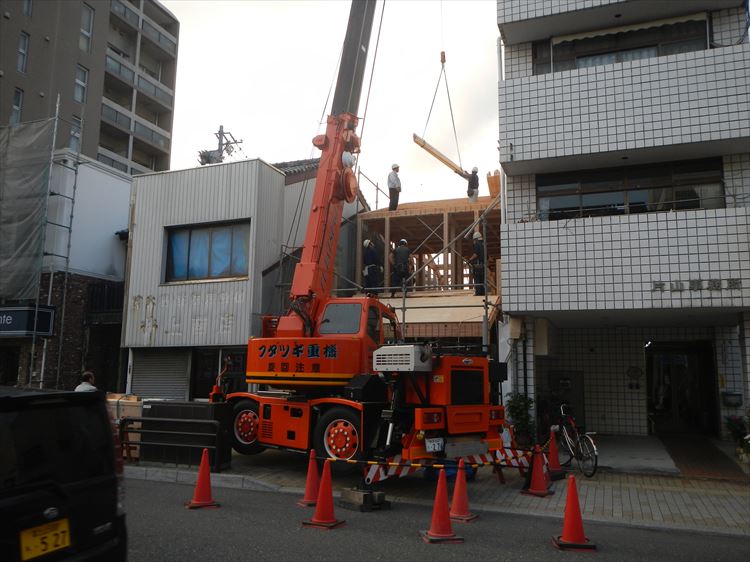 静岡市葵区伝馬町の現場の建前を行いました。静岡市街地の狭小地、前面道路は旧東海道の交通量が多い道路、歩道規制の道路使用、小学校隣接等、気を付けなければならない条件が多い現場です。