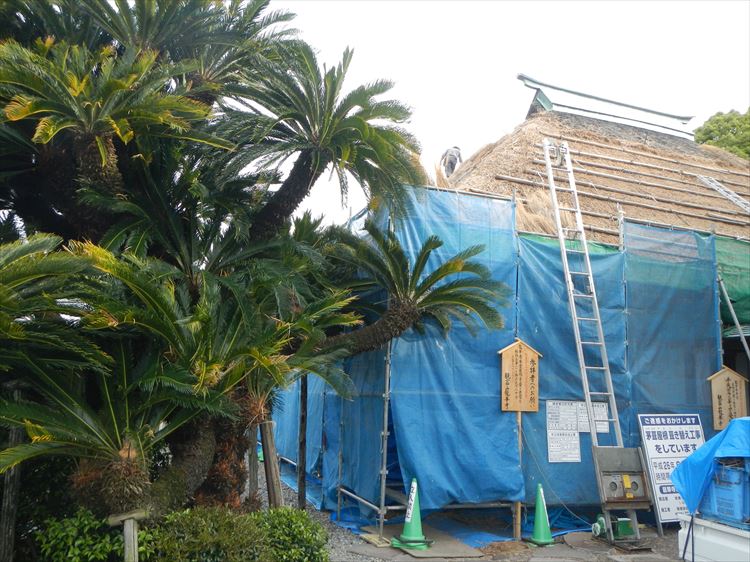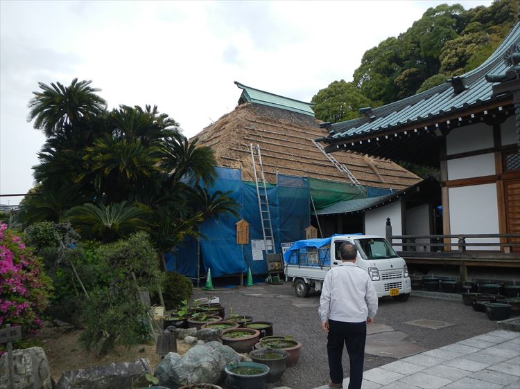 そんな中、社長がメインで担当する龍華寺の工事の内、工事も終盤に差し掛かっている本堂の茅葺屋根の葺き替え工事の確認に行ってきました。