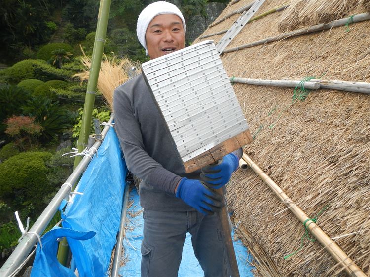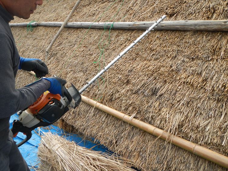 最後に足場を外しながら茅を刈り込んで綺麗に揃えていきます。