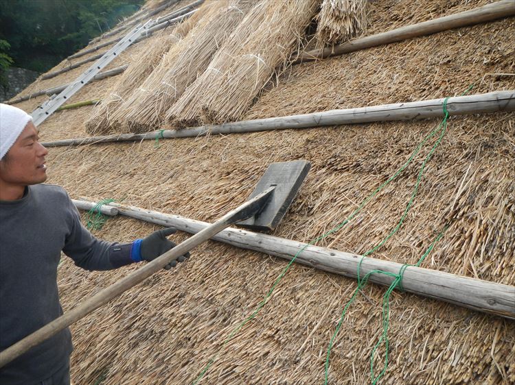 裏が洗濯板のような形状をしたカギ板と呼ばれる道具で下から上に突き上げるようにして茅を押し込んでいきます。