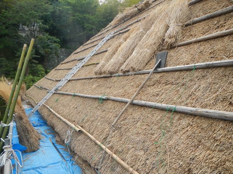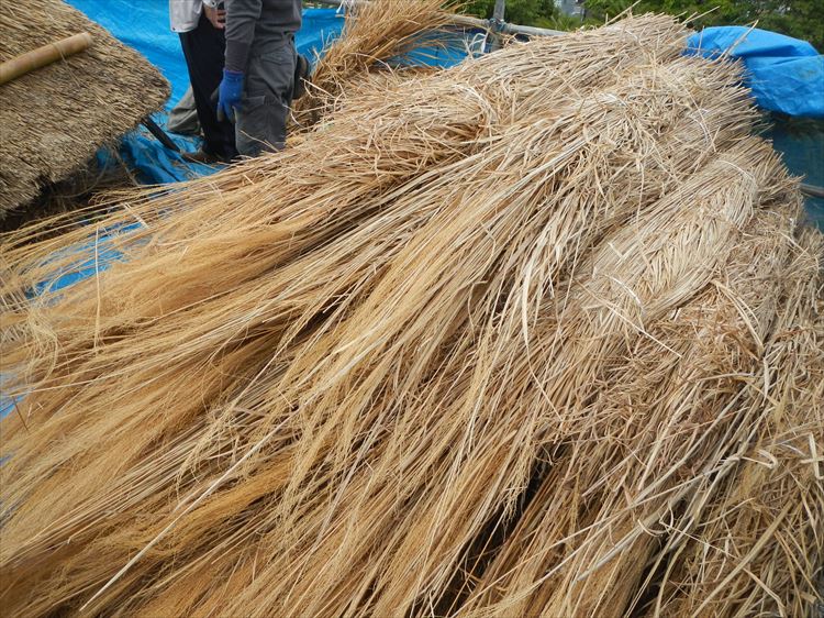 今回の工事は茅の全部交換ではなく、厚みで言う半分の交換工事。写真の上部に見える黒い所が昔の古い部分です。古い茅を引っ張り出して50㎝程切り取り、新しい茅と一緒にして押し込んでいきます。2m近くもある立派な茅の穂先部分を切り落とし差し込みます。