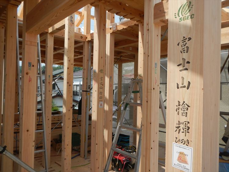 静岡市清水区迎山町の現場が上棟いたしました。お施主様ご自身が切り出した木で家を建てる”興津川木の家プロジェクト”の2件目の取り組みのお宅です。8寸(24㎝角)の太さに製材して大黒柱として納めてもらったのですが、太さの存在感以上に”想い”のオーラを強く感じました。