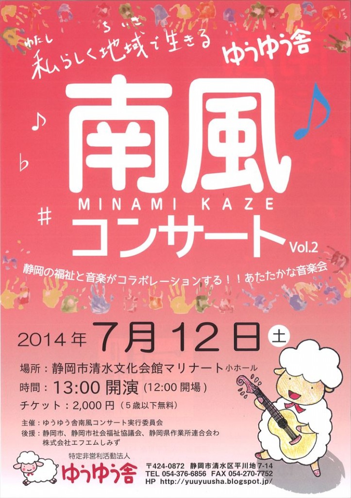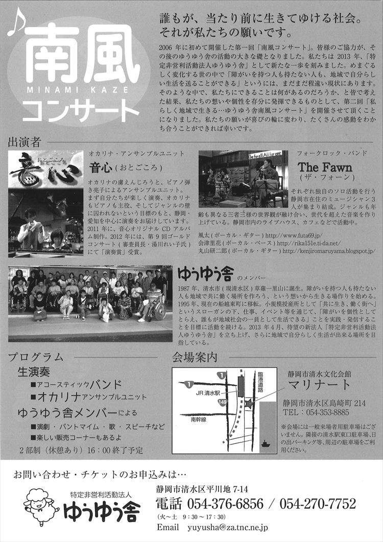 昨年度末リノベーション工事をさせて頂いた特定非営利活動法人ゆうゆう舎さんが主催する音楽会「第二回南風コンサート」のお知らせが届きましたのでご案内させて頂きます。