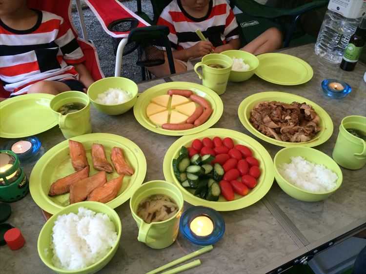 夜はご飯を炊いて、チキンのコーラ煮、サーモン・チーズ・ソーセージの燻製、野菜に味噌汁といったメニュー。最近「とりあえず焼肉・・・」的なキャンプはやめて、メニューを決めて食べられる量を簡単にをテーマにして、ゴミも減らすように心がけています。