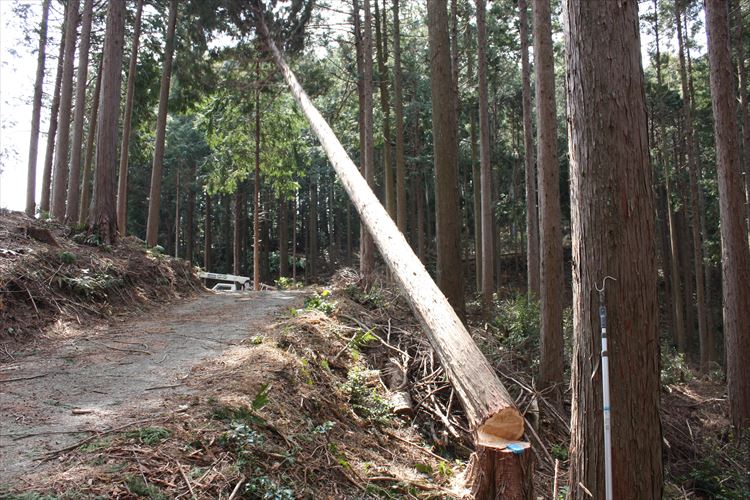 お施主様が興津川木の家プロジェクトの第1弾のお宅の見学会に来られ、その取り組みに共感して頂き、第2弾を建たせて頂くことになりました。興津川の上流の山に行き、お施主様に8寸の大黒柱となる木を選んでもらい、ご自身でその木を切り倒して頂きました。