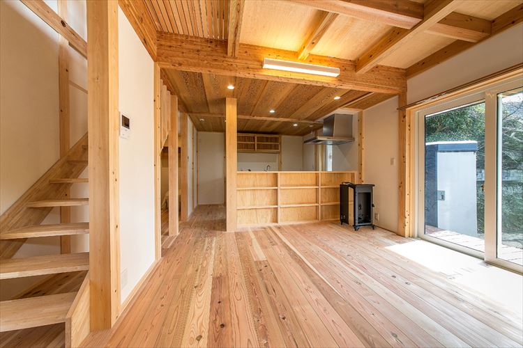これまでの大功の家のベースとなっている、長期優良住宅(耐震等級は最高ランク)、住宅性能表示制度の活用、静岡の杉ヒノキを多く使用したしずおか優良木材支援制度の活用、内装材の静岡市産材の利用、SGEC森林認証材の利用等はこれまで通り行っております。天井の梁の表し、漆喰の塗壁、ペレットストーブの採用で、これまでの大功の家とは違ったテイストを感じて頂けることと思います。