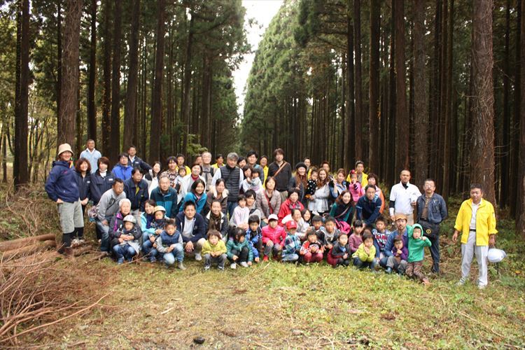 バス3台でスタッフも含めて約70名の大人数となった木こりツアー。今回向かった先は、今春ヒノキの苗木の植林を行ったマルダイさんの社有林。東京ドーム約3個分の広さの森で、約60年生の人工林の杉やヒノキが植えられております。