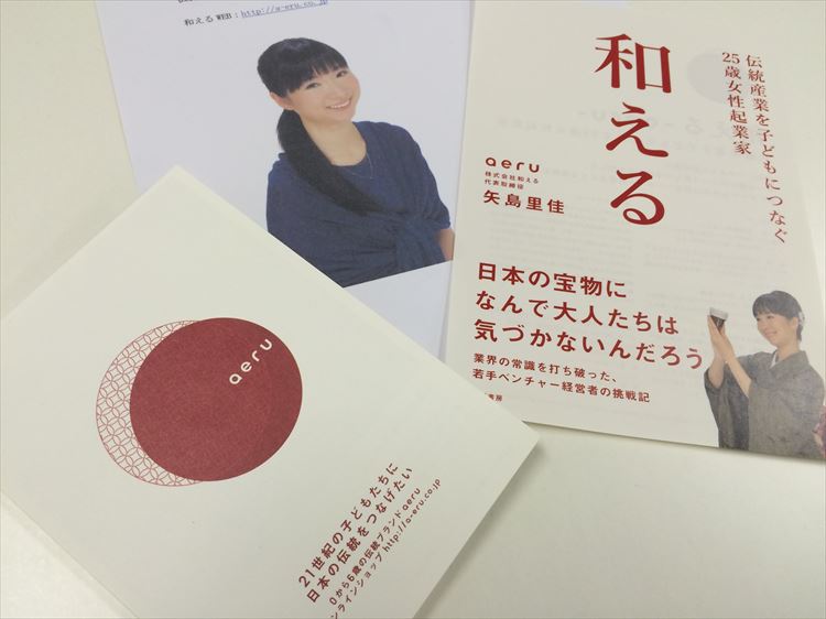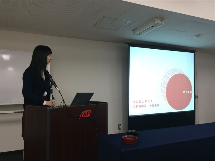 矢島さんからは、「原点回帰のビジネス発想・aeruの挑戦!」と題して、21世紀の子供達に、日本の伝統を伝えたいという想いから学生時代に会社を立ち上げ、子供達の為の日用品に日本の伝統技術を融合させた商品”aeru”の開発秘話をお話して頂きました。まだ26歳とは驚きです!!