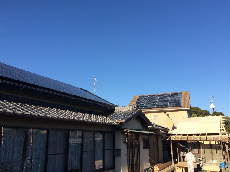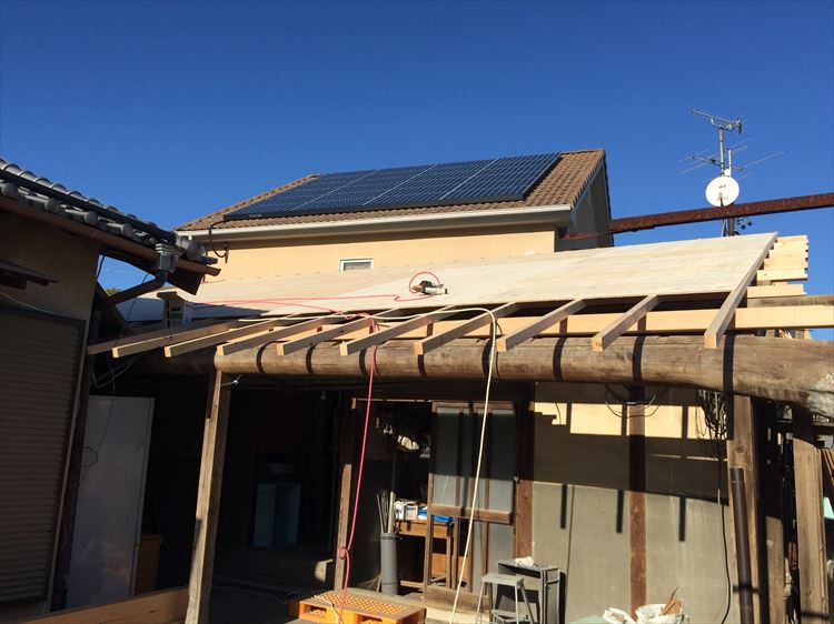 自宅と納屋は建物が古く耐震性にも心配があったので、重い瓦屋根から軽い金属板のガルバリウムに葺き直し、太陽光を取り付けております。