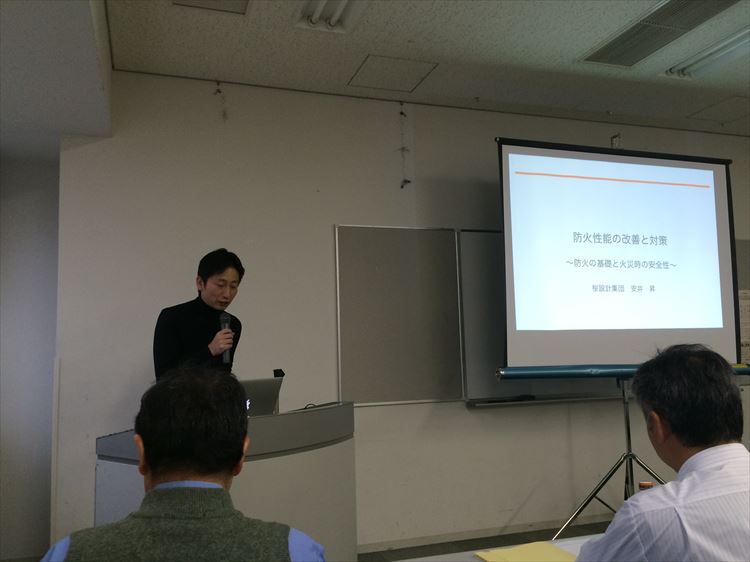一年を通して8回の授業を受けるのですが、今回はその6回目。第一講義では「防火性能の改善と対策 防火の基礎と火災時の安全性」と題して、安井昇さんに講義して頂きました。家の構造が木なのか鉄なのかコンクリートなのかということは防火上重要ではなく、出火源まわりの内装が重要ということが良く分かりました。