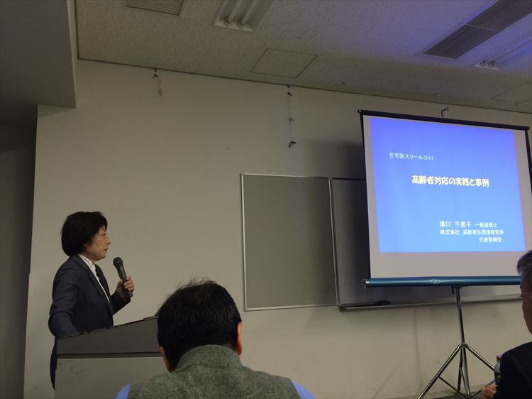 第三講義は「住宅改修における高齢者対応 高齢化社会と住宅改修のニーズ」、第四講義は「高齢者対応の実践と実例 バリアフリー改修の実践実例」と題して、溝口千恵子さんに講義して頂きました。溝口さんはケアマネージャーさんからの仕事を良くやられているので、現場のリアルな話がとても参考になりました。
