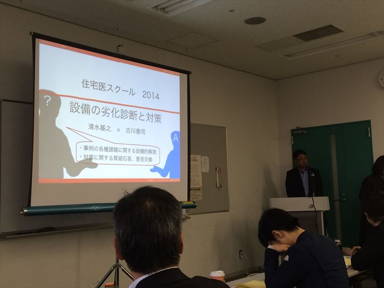 第二講義は「設備の劣化診断と対策 配管設備Q&A」と題して、清水基之さんと古川泰司さんに講義して頂きました。設備屋さんである清水さんの話がとても面白く、使用する材料の判断基準や施工性の良し悪しなど、現場の声として説明して頂けたのがとても分かりやすかったと思います。