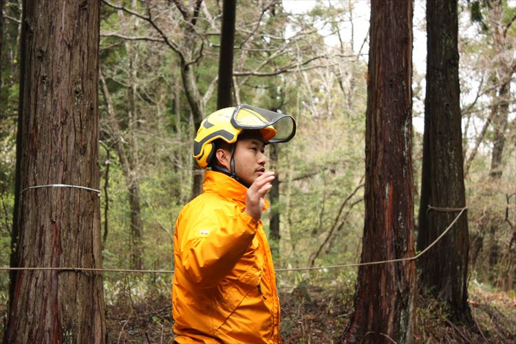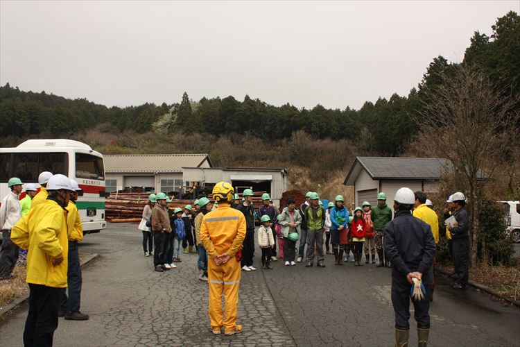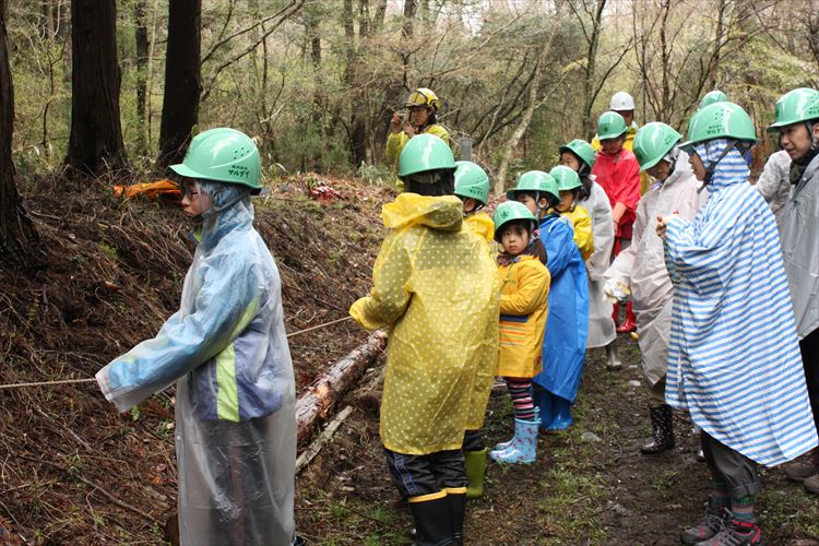 マイクロバス2台に分乗してマルダイさんが管理する朝霧高原近くのSGECの森に向かいました。春の木こりツアーは木々が水を吸い上げる時期という事もあって、メインのイベントはヒノキの苗木の植林作業の体験として、サブで木こりさんと一緒に伐採体験をしてもらいました。