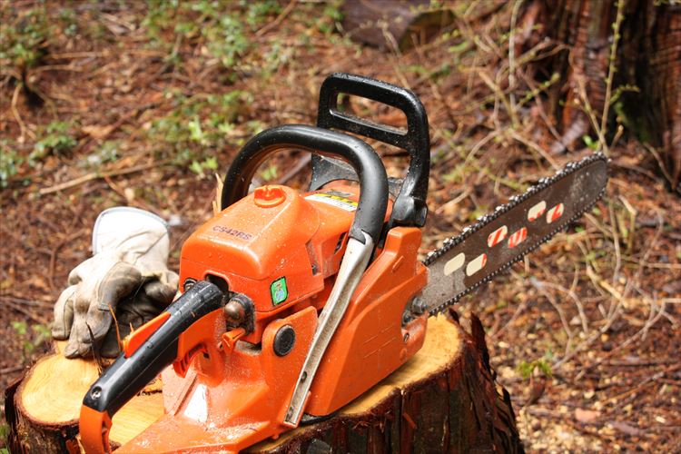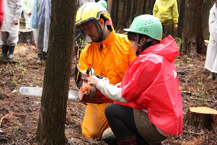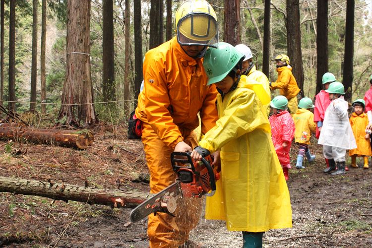 倒した後はチェーンソーを使っての玉切り体験。切った木は記念に持ち帰って頂きました。