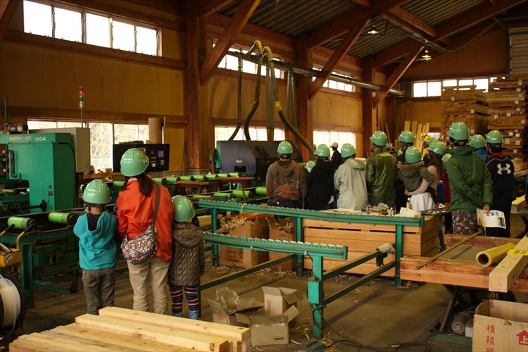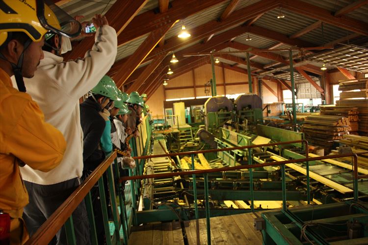 午後からは場所を富士ひのき加工協同組合の工場に移し、切り倒された丸太が製材されて柱や土台や板になる過程を見学しました。