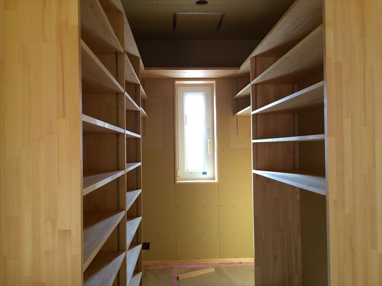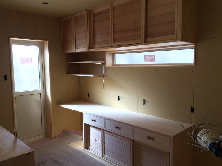 造り付けの家具もほぼ取付が終わり、段々と生活感が出てきました。この造り付け家具で使用している木はアカマツのフリー板。枠や巾木と同じ材種ですので統一感が出て納まりが良かったです。