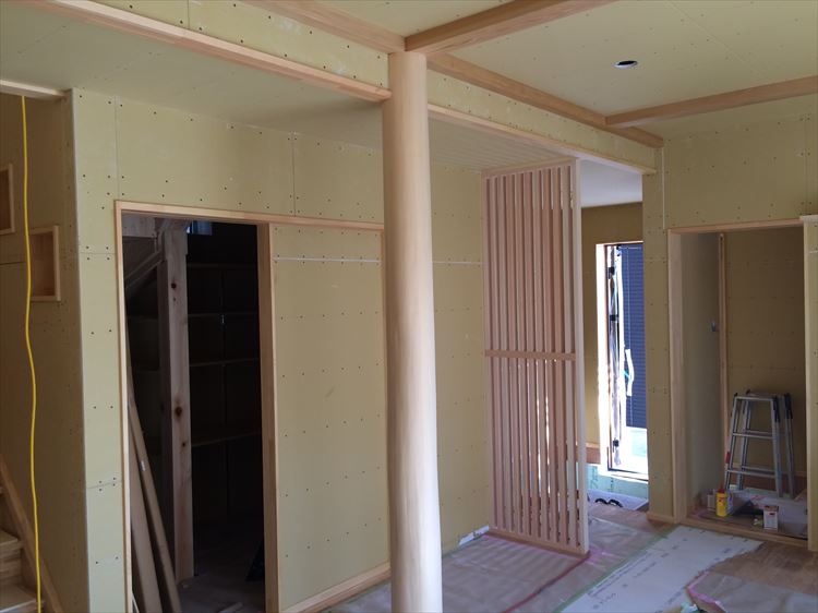 現場の状況は、大工工事がほぼ終わり、塗装屋さんが木部の塗装を進めている状況で、引き続き内装屋さんが自然素材の壁紙のオガファーザーを貼っていく予定です。