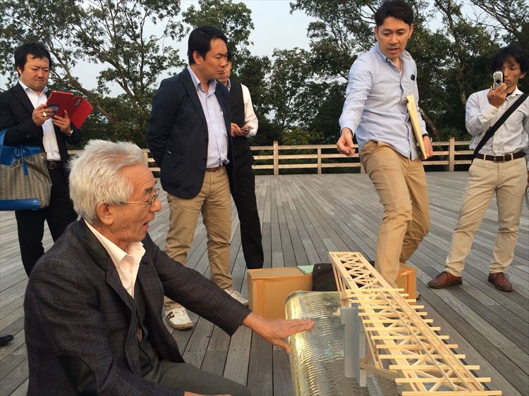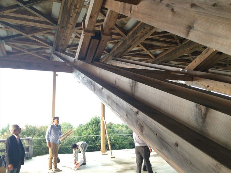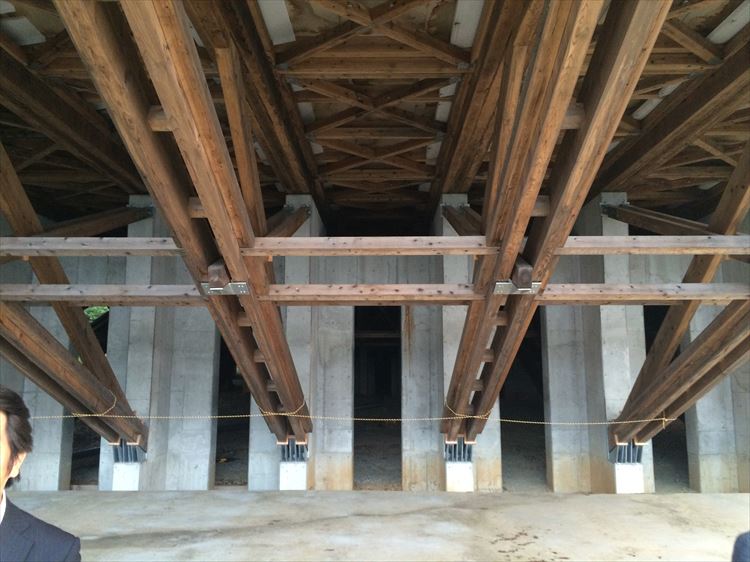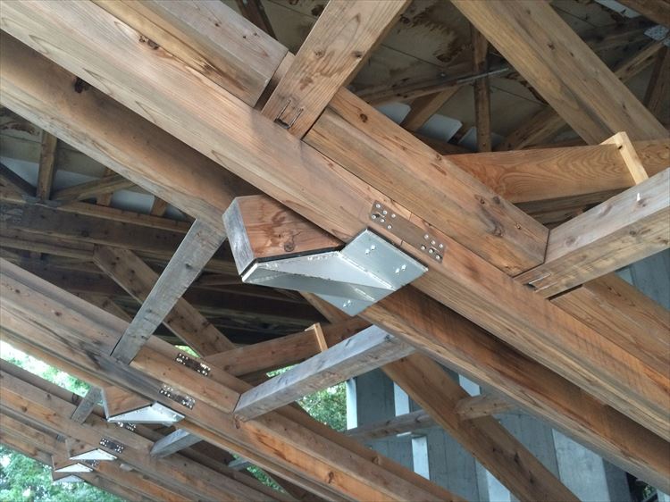 美しいフォルムの方杖トラス、昔作った割り箸鉄砲のようでした(笑)。約12mもの長さの張り出しがあるため木材の断面も大きかったのですが、木材の性質を考えながらの補強の仕方、水の抜かせ方、交換部材の考え方、設計上の配慮が大変勉強になりました。