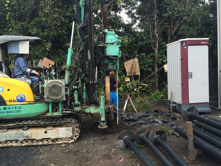 先日、静岡市葵区の「羽鳥の家」で、地盤改良工事の杭打ち工事を行いました。事前調査で行った地盤調査の結果、表層部の支持力はあったのですが、一番家の荷重を負担する深さの層(1m~3m)で軟弱層があったため、4m付近にある支持層まで鋼管杭を打設する計画としました。