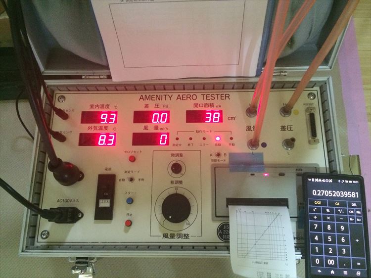 測定結果は0.27㎝2/㎡。家全体の隙間を合計した数値が38㎝2。6㎝×6㎝くらいの大きさの隙間と想像してください。結果は大功の家での平均値位。社内基準値より下回っていたので断熱&気密工事が合格という事で、次工程に進むことになります。