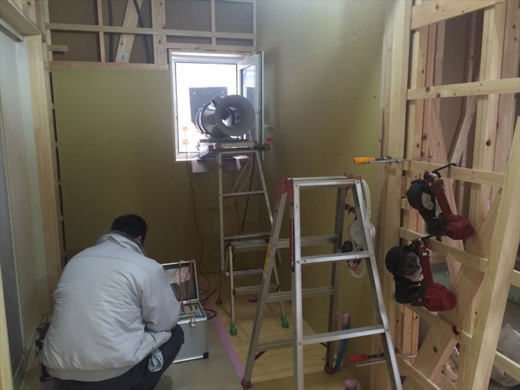 大功の家では気密試験を、断熱工事が終了した時点とお引き渡し時の2回、全棟で行う事を決めております。今回は羽鳥の家で断熱工事が完了した1回目の測定を行いました。
