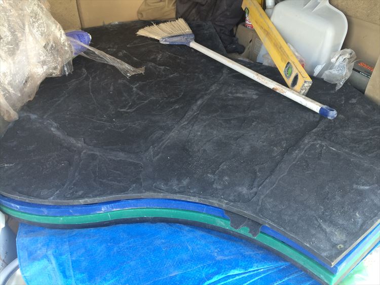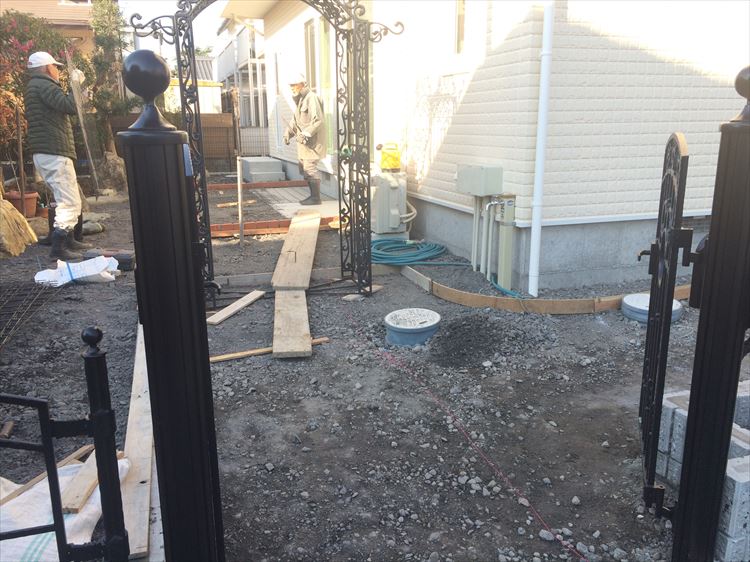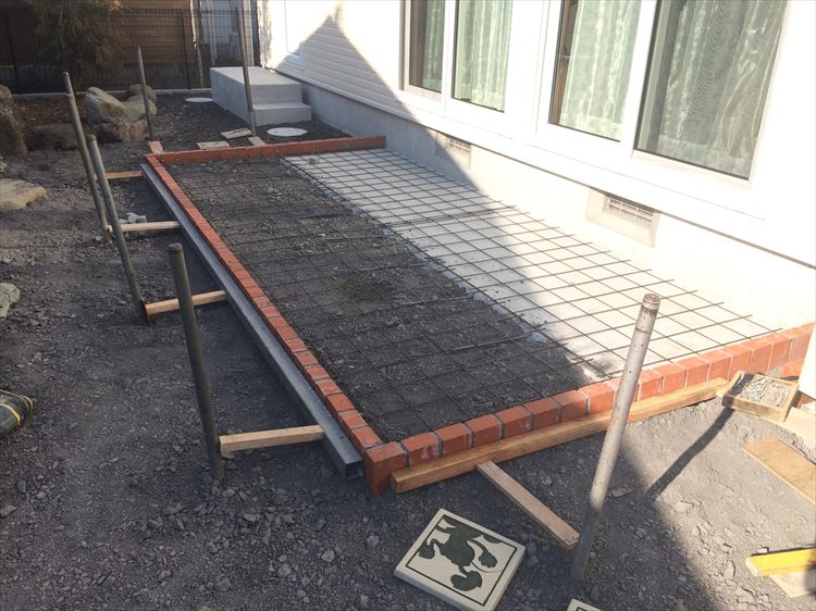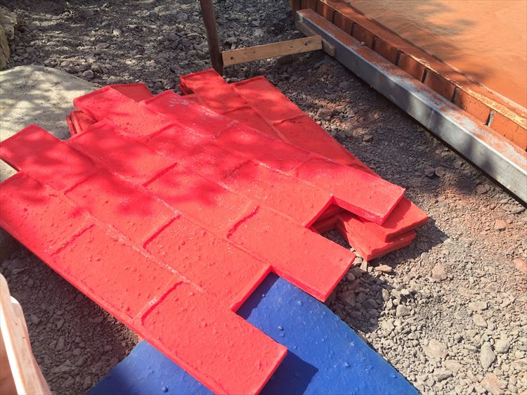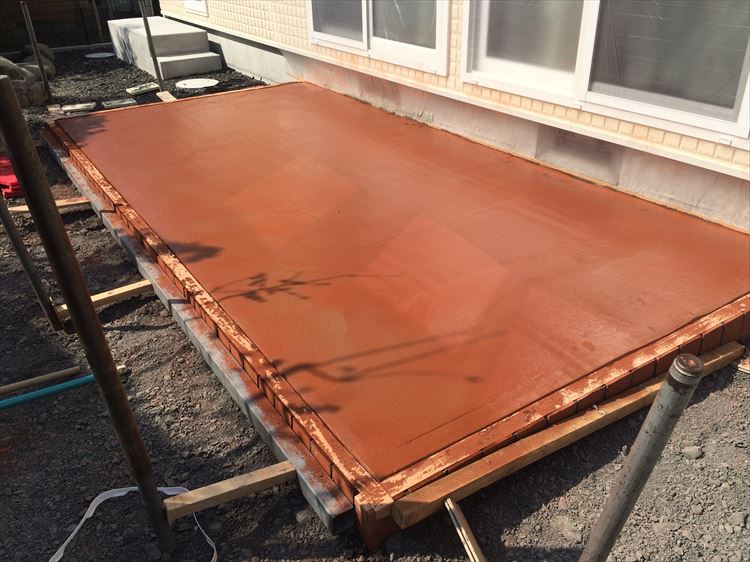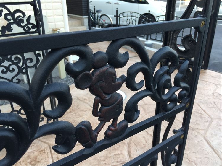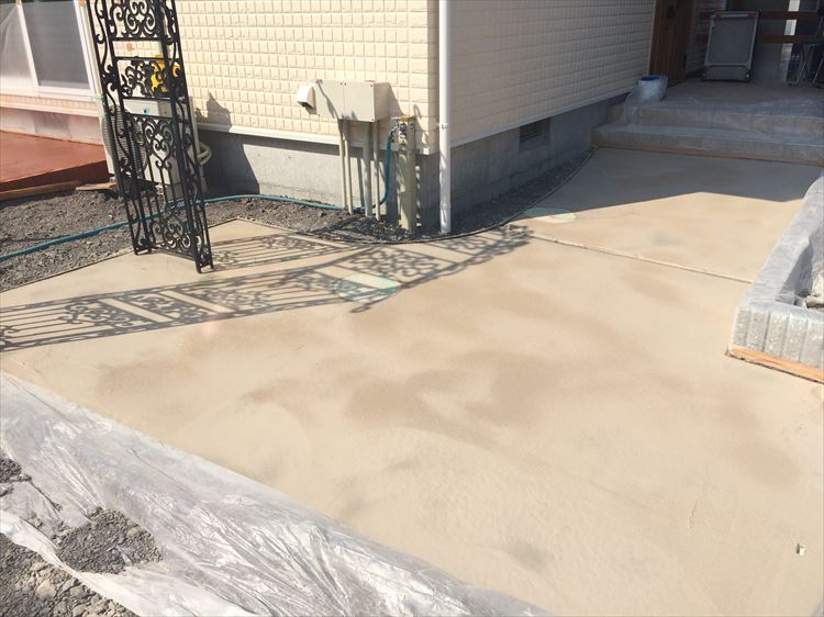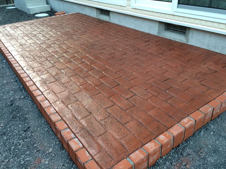 清水区の春日の家にて先日外構工事をさせて頂きました。 門扉から玄関ポーチに繋がるアプローチの仕上げがなかなか決まらなかったのですが、ディズニーが好きなお客様だったので、ディズニーランドやシーで採用されている技術のスタンプコンクリートの仕上げを提案し採用して頂きました。 スタンプコンクリートは普通コンクリートを打設したところに色を乗せ、写真のような色々な柄のシートをコンクリートが乾かないうちにペタペタ押し付けることで色々な表情に仕上げることが出来ます。石を並べたり、レンガを並べたりするよりも経済的です。 アプローチもテラスも可愛い仕上げとなりました。ミニディズニーランドの完成です!!