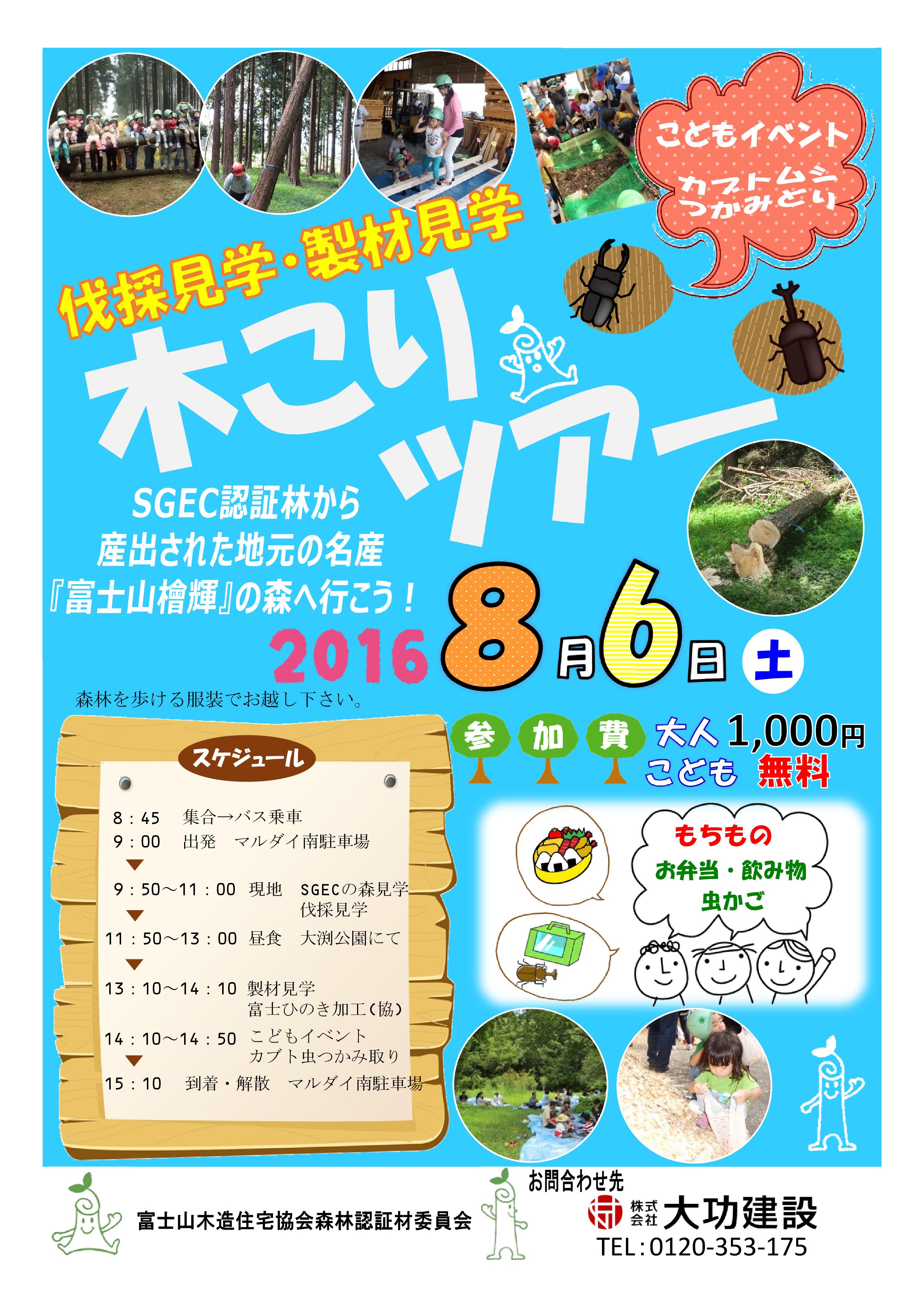 この木こりツアーは、弊社が所属する富士山木造住宅協会森林認証材委員会が主催するもので、今年で7年目を迎えます。ご自宅の土台や柱に使われるかもしれない木々が生育するSGECの森に行き、年間を通して山で活動するイベントを企画しております。