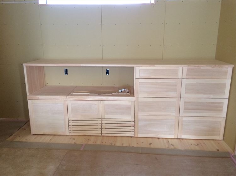現場には作業場で製作された大功オリジナル家具が、大工さんの進捗に合わせて現場搬入されて取り付け作業も進んでいます。