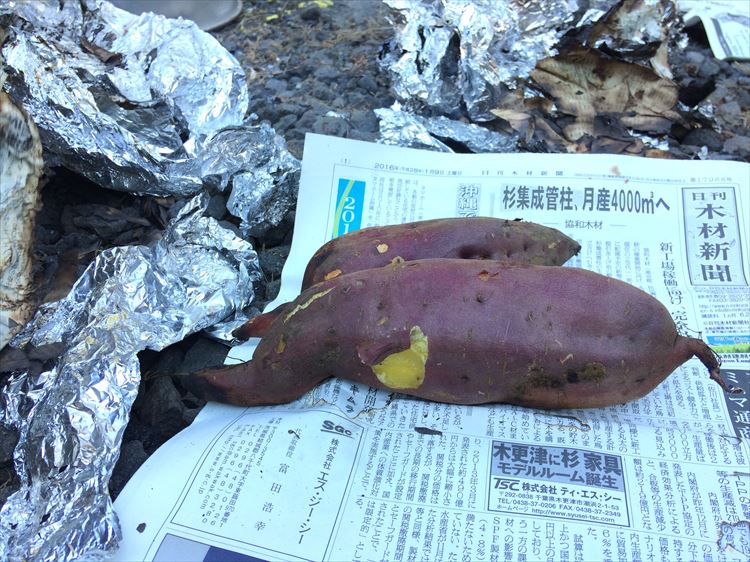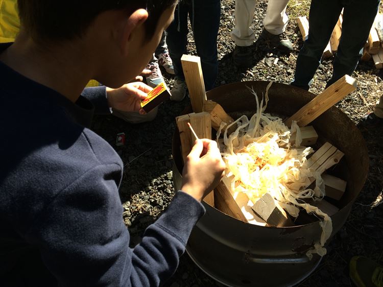 昼食前に子供達にマッチ擦りを体験してもらい、火をつけて焼き芋の準備を。やはり、皆さんマッチの擦り方が判らず、火が着いたらすぐ投げてしまったりと、貴重な体験が出来たようです。