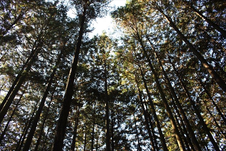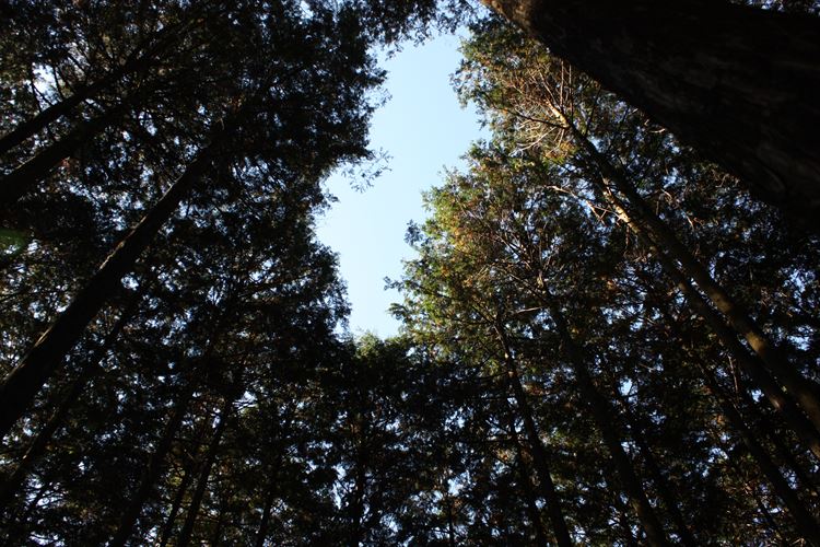 間伐することによって、葉っぱで生い茂ったところ(左)も下の写真のようにスッポリと空が見えるようになって(右)、太陽の光が地面まで多く届くようになります。皆さんご存知でしたでしょうか?木の一番の栄養源が、肥料や水ではなくて太陽の光であるという事を!! 周りの木々や足元にある木の苗木もどんどん大きくなっていくことでしょうね。