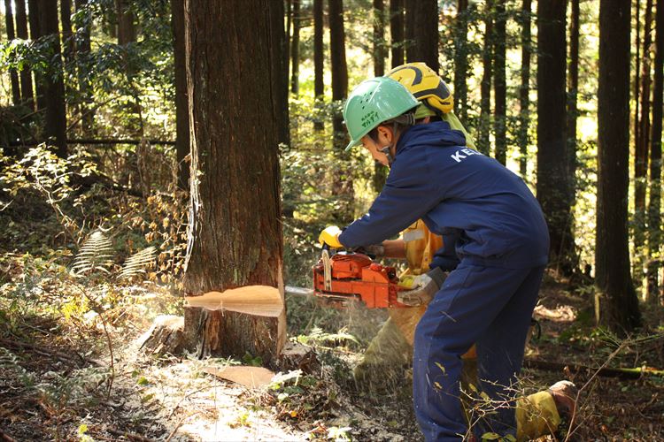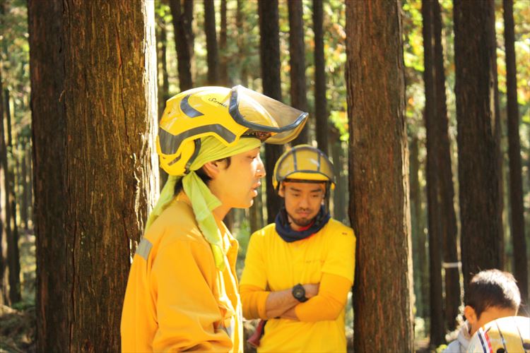 参加者が多かったので2班に分けての活動です。我々は「木こり体験」からスタート。木こりのソマウッドの鈴木さんから、山の事、木の事の話を聞いて、間伐という作業を力を合わせて皆さんで行いました。