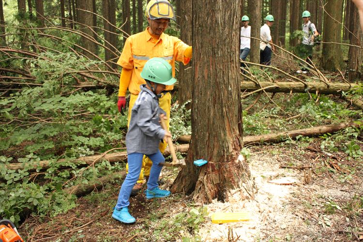 今回のお宅は二世帯住宅で、お施主様のお子さんも小さかったことから、大黒柱の伐採体験もして頂きました。ご家族で山に行き、皆さんで大黒柱になる木を選んで頂き、木こりと一緒に力を合わせて切り倒した木から大黒柱を製材し使用しました。