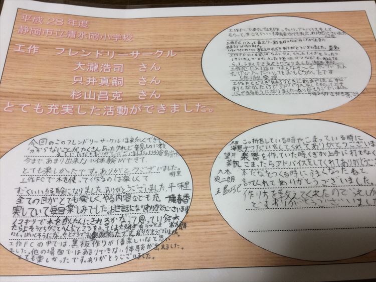 感謝の会にて子供達からお手紙をもらいましたが、みんな工作クラブが楽しかったようでホッとしました。普段出来ないことが出来たとか、上手に釘を打つことが出来るようになったとか、物づくりの難しさと楽しさが分かったようです。