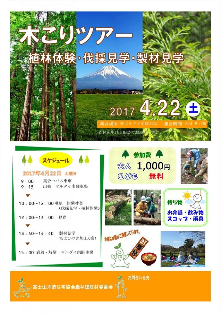 4月22日(土)は、毎年恒例となり、昨年度ウッドデザイン賞を受賞した木こりツアーを開催します。春先のこの時期は、木が水を多く吸い上げる時期でもありますので、ヒノキの苗木の植林を体験して頂きます。