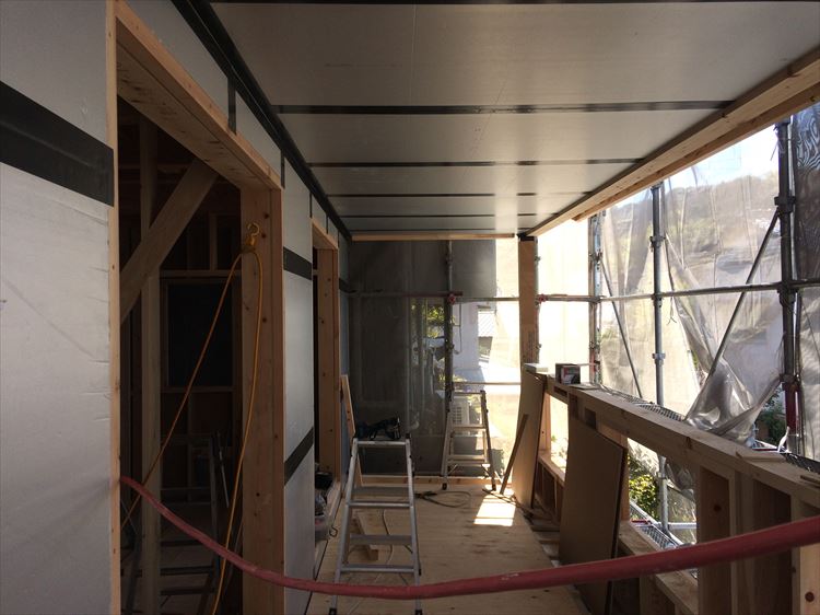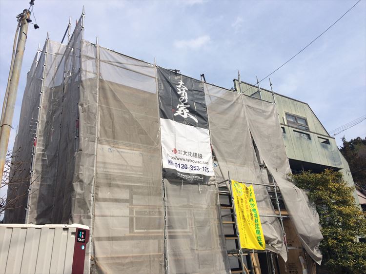 大功の家は外貼り断熱といって、柱を外側から断熱材でスッポリと覆い被せる工法を採用しているので、壁の中に断熱材を詰め込むグラスウールやウレタン断熱なんかよりも、高い気密性能を発揮しやすく、その状態を何十年も維持しやすい特徴を持っています。