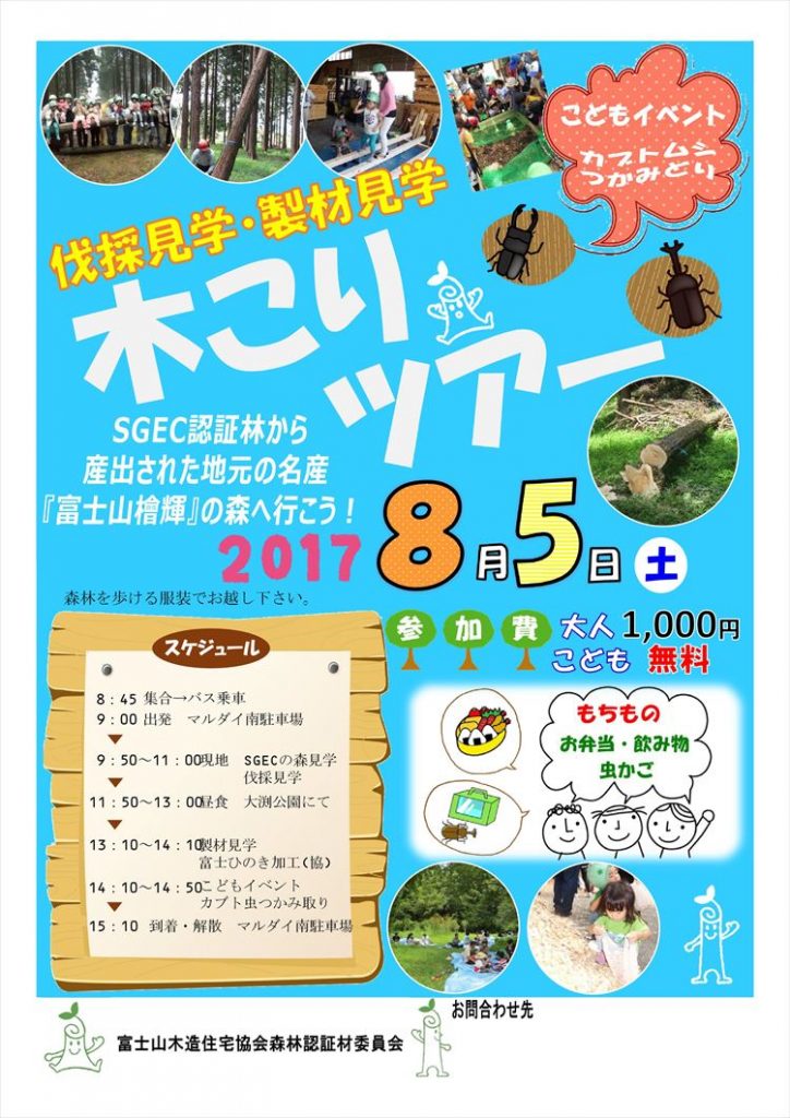 この木こりツアーは、毎年、春・夏・秋の3回開催していて、8年目になるイベントです。静岡の富士山周辺の山に行き、木こりの活動の体験、製材所の見学、植林体験、木工教室など、山での活動を通じて木のことを知り、木こりや製材所の仕事を知り、どのような工程を経て木造住宅に必要な材木が生産されているのかを知っていただくことを目的としたツアーです。