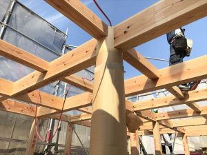 そんな想いがこもった大黒柱が山を下って現場に運ばれて、無事に上棟を迎えることが出来ました。丸太の大黒柱、1FのLDKと2Fのホールに、どーんと家を支えて立っております。