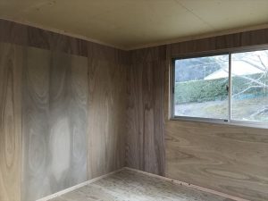 6畳の広さの木造の小屋の中に、エアコンや照明やテレビなどの家電、