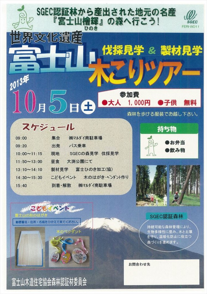 今年最後の富士山木こりツアーのご案内です。見学先の富士山の麓にあるSGECの認証林は、持続可能な森林管理により、生物多様性に富み、水と土壌を守り、富士山の環境保全に貢献している森林です。秋口の気持ちがいい空気を吸って、森林浴に出かけませんか? 参加希望の方はコチラから(木こりツアー参加希望と書いてください)
