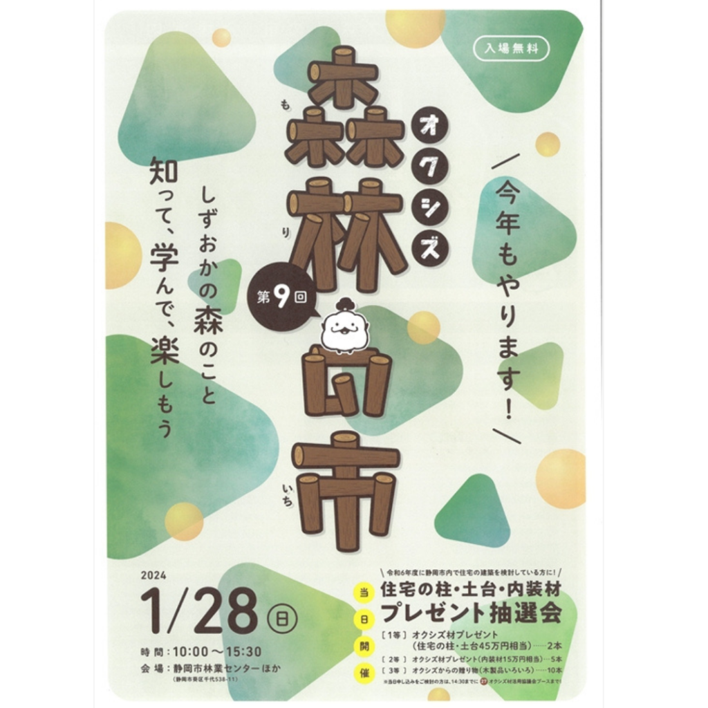 今年もオクシズ森林の市が開催されます。 弊社のブースでは、過去に行って大盛況でした オクシズヒノキでのおもちゃを作るWSを行います。 宜しければブースにお立ち寄りください。 1/28(日)10:00~15:30 静岡市林業センター(静岡市葵区千代538-11 駐車場は河川敷) お近くにお越しの際は是非お立ち寄りください!!